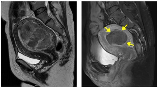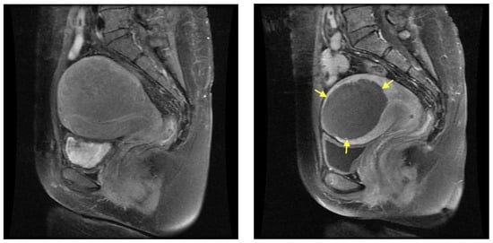 Magnetic resonance (MR) images of adenomyosis from a 47-year-old woman: (Left) pre-HIFU MR image showing extensive adenomyosis involving mostly the posterior fundal uterine wall; (Right) post-HIFU MR image, 6 months after treatment, showing a hypoperfused well-defined area (arrows) as the result of HIFU.