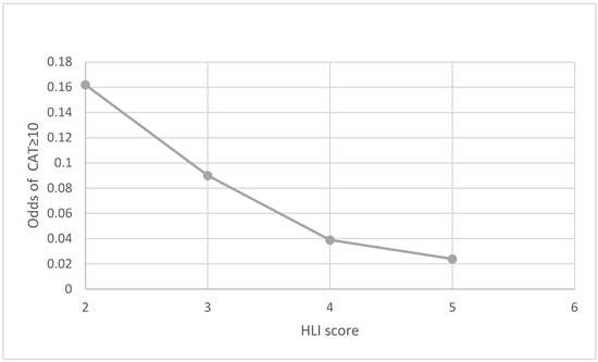 Higher HLI scores were associated with decreased CAT score after adjustments for age, gender, education, marital status, and comorbidities. More specifically, every 1-point increment of HLI was associated with a decrease of 2.3 points in the CAT score (95% CI −3.1 to −1.5, p < 0.001) and optimal HLI (3 or higher) was positively associated with a decrease of 3.6 points in the CAT score (95% CI −5.1 to −2.0).