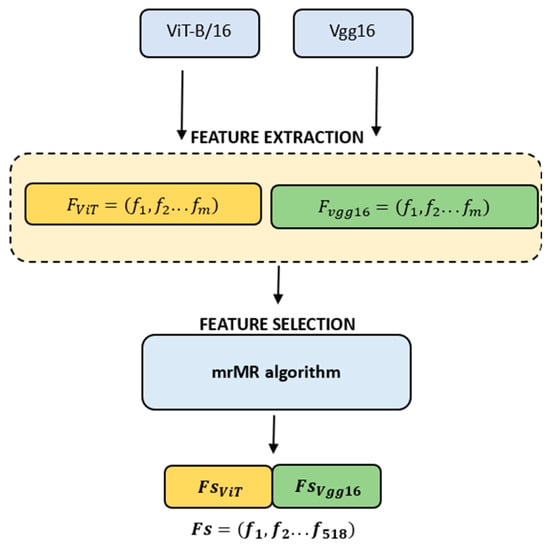 Feature selection was performed to eliminate unnecessary features. Among the 13,696 features in the third layer of VGG16, the 32 features with the highest correlation were selected. Similarly, out of the 151,296 features obtained with the ViT, 486 features with high correlation were selected. The mRMR algorithm was used for feature selection. mRMR is a feature selection algorithm based on the Maximum Relevance Minimum Redundancy criterion. It analyzes the relevance between features and the class and the redundancy among the features themselves. For this analysis, Euclidean distance, Pearson correlation, and information measurement are used. The mathematical expressions of the mRMR algorithm are given in Equations (1) and (2) []. The proposed model is shown in the flow diagram in Figure 4.