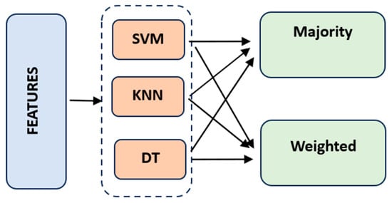 Both majority voting and weighted average voting were used. In majority ensemble learning, each model in the ensemble makes its own prediction for a given input or example. The final prediction is then determined by selecting the class label that receives the most “votes” or agreement from the individual models []. In classification tasks, the class label with the highest prediction frequency across the ensemble is selected as the final prediction. In a weighted average, each model in the ensemble makes a prediction for a given input. Each prediction is assigned a weight that reflects its relative importance or reliability. The final estimate is obtained by calculating the weighted average of the individual estimates, where each prediction is multiplied by the corresponding weight.
