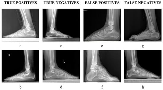 There could be multiple potential causes of FN and FP outcomes. Initially, the suggested system lacked sufficient training on two groups: adolescent X-rays with open physis and those with other foot abnormalities. A pes cavus deformity (Figure 6f) and an adolescent foot with an open physis (Figure 6e) were most likely to blame for two of the FP results in our test group. Comprehending the cause of FN X-rays is more complicated. We categorized X-rays based on the calcaneal inclination angle, which is determined by measuring the angle produced by lines running from the bottom of the calcaneocuboid joint to the same horizontal line running along the bottom surface of the calcaneus to the lowest point of the fifth metatarsal head []. We discovered that, in our FN outcomes, the other metatarsal bones completely encircled the fifth metatarsal bone, making it impossible for our AI system to precisely detect its borders. This may be a potential cause of the FNs.