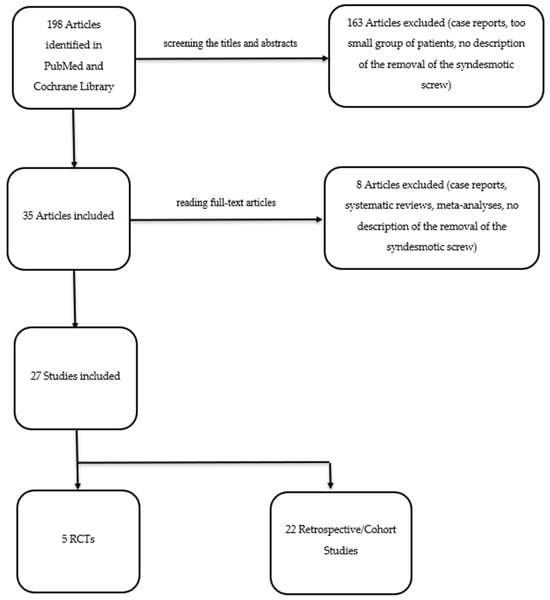 A total of 198 articles were retrieved through the search process. After screening the titles and abstracts, 163 articles were excluded. Among the remaining 35 articles, an additional 8 were eliminated after reading the full text. These exclusions were based on the articles being either case reports [12], systematic reviews [5,6,7,9], meta-analyses [8], or studies in which syndesmotic screws were not removed. Of the twenty-seven articles that remained, five were identified as randomized controlled trials (RCTs), while the remaining twenty-two studies were retrospective or cohort studies (see Figure 1).
