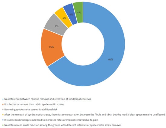 The majority of these articles indicated no significant variance between the routine removal and retention of syndesmotic screws following tibiofibular syndesmosis fixation (18 out of 27; 67%) [13,14,15,16,17,18,19,20,21,22,23,24,25,26,27,28,29,30]. Only four retrospective studies suggested that retaining syndesmotic screws might yield inferior outcomes compared to their removal (4 out of 27; 15%) [31,32,33,34]. Additionally, some studies suggested that removing syndesmotic screws could pose additional risks for patients (2 out of 27; 7%) [35,36]. After the removal of syndesmotic screws, there is some separation between the fibula and tibia, but the medial clear space remains unaffected (1/27 cases; 4%) [37]. It appears that syndesmotic screw breakage might pose greater challenges than previously understood. In particular, intraosseous breakage could lead to increased rates of implant removal due to pain (1/27 cases; 4%) [38]. Additionally, there are no notable discrepancies in ankle function among the groups with different intervals of syndesmotic screw removal (1/27 cases; 4%) (Figure 2) [39]. A meta-analysis was considered impossible due to the heterogeneity of the data.