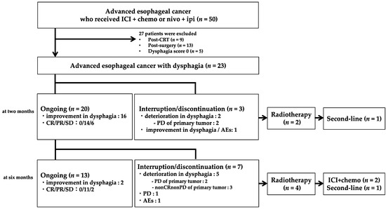 Of 23 patients, 22 received ICI plus chemotherapy (16 received pembrolizumab plus FP, and 6 received nivolumab plus FP), and 1 was treated with nivolumab plus ipilimumab. Figure 1 shows the flow diagram 6 months after treatment started. Within 2 months from the start of first-line treatment, it was discontinued in three patients due to PD in the primary tumor (n = 2) and adverse events (n = 1). Among them, two patients with PD received radiotherapy on the primary tumor. After radiotherapy, one patient was treated with paclitaxel as a second-line treatment. Between 2 and 6 months from the start of first-line treatment, treatment was discontinued in seven patients due to deterioration in dysphagia (two were PD and three were nonCRnonPD in the primary tumor), PD (n = 1), and adverse events (n = 1). Among them, four patients received radiotherapy. After radiotherapy, two patients resumed first-line treatment, and one was treated with paclitaxel.