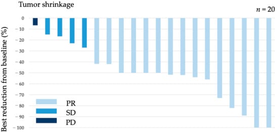 The objective response rate (ORR) was defined as the proportion of patients with CR or PR among those with a target lesion. The disease control rate (DCR) was defined as the proportion of patients with CR, PR, or SD. Patients without measurable lesions were excluded from the response rate analysis. Progression-free survival (PFS) was defined as the duration from the first administration of chemotherapy to the radiological or clinical observation of disease progression or death from any cause. Overall survival (OS) was defined as the duration from the first administration of chemotherapy to death from any cause. The maximum tumor shrinkage rate was defined as the maximum change ratio in the tumor diameter after treatment and was evaluated in patients with a target lesion.