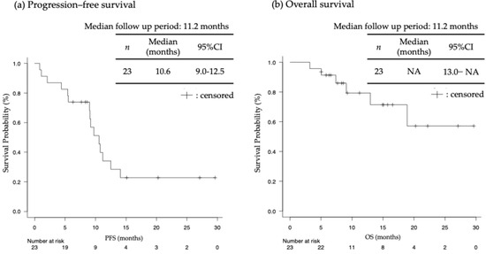 (a) Progression–free survival (PFS); (b) overall survival (OS) (n = 23). NA: not analyzed.