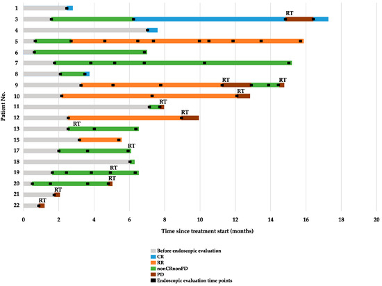 For nonmeasurable lesions, including the primary tumor, evaluation with endoscopy was used to define response. CR was defined as the complete disappearance of the primary tumor, confirmed by biopsy. NonCRnonPD was used to define primary tumors without evidence of progression, and PD was used for primary tumors with noticeable progression. In patients with nonCRnonPD, remarkable response (RR) was defined as a remarkable shrinkage in tumor volume to nearly the T1 depth after treatment [11].