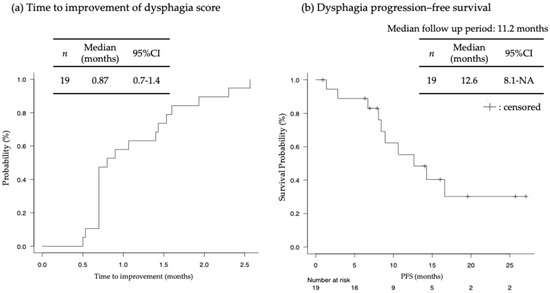 (a) Time to improvement of dysphagia score; (b) Dysphagia progression–free survival in patients who experienced relief in the dysphagia score by at least one level (n = 19). NA: not analyzed. PFS: progression–free survival.