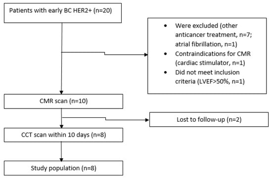 Study population was determined after applying inclusion and exclusion criteria (BC: breast cancer; HER2: human epidermal growth factor receptor 2; LVEF: left ventricle ejection fraction; CMR: cardiac magnetic resonance; CCT: cardiac computer tomography).