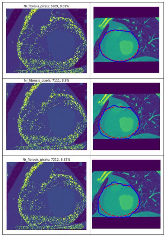 The results obtained from applying the developed algorithm to the CT images of patient 1 are presented in Figure 2. The left column illustrates the regions automatically identified by the algorithm as containing fibrotic tissue, indicated by the pixel value, measured in HU, within the range of 60–90 HU. The second column displays the heart region detection using the Snake algorithm applied to the entire CT image. The starting region is marked in red, while the final region, determined after completing the specific iterations, is outlined in blue. Notably, the algorithm successfully identifies both the heart region and areas of fibrosis across different images of the same patient, demonstrating its consistency and reliability when applied to native CT images.