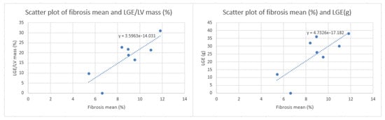Scatter plot of fibrosis mean (%) compared to LGE/LV mass (%) and LGE (g).