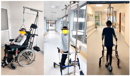 Halo-gravity traction (HGT) is commonly utilized in clinical practice to mitigate the surgical risks in pediatric patients suffering from severe scoliosis prior to undergoing significant corrective procedures [37,38,39]. This method involves affixing a halo ring to the patient’s cranium in order to manage the advancement of the underlying spinal deformity [39,40]. The subsequent cephalalgia post-treatment is typically minor and endures for a period of 2–3 days. The procedure itself is generally painless for the pediatric patient, and research has indicated that children often experience a sensation of weightlessness during traction [41,42,43]. Application of the counterbalance is gradually increased until it reaches 50% of the total body weight. The duration of the traction regimen varies based on the extent of the deformity; nevertheless, the majority of patients undergo traction for a span of 3 weeks [34,37,41]. This method serves to elongate and align the spine, thereby enhancing its flexibility and lessening curvature prior to definitive surgery, consequently diminishing the surgical hazards and enhancing the overall outcomes. An example of a patient with severe kyphoscoliosis treated with pre-operative HGT is presented in Figure 1.