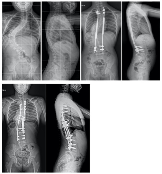 A 17-year-old female patient underwent a series of surgical procedures involving the less invasive temporary internal distraction technique followed by posterior spinal fusion. Radiographs were conducted before the initial stage, after the first stage, and post-operatively during the final follow-up.