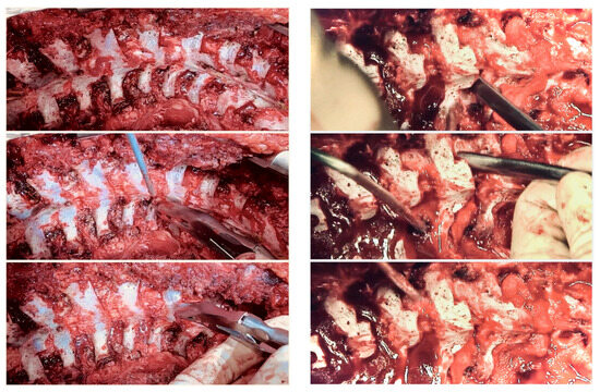 Severe scoliosis is characterized by bony changes that cannot be fully corrected through the release of soft tissues alone. When determining the appropriate osteotomy type to address this condition, several factors come into play. These factors include the extent of correction needed, the specific location of the deformity, the degree of imbalance in both the sagittal and coronal planes, the overall health status of the patient, and the expertise of the surgeon involved [19,26]. In numerous academic publications, the terms Ponte and Smith-Petersen osteotomy (SPO) are often used interchangeably, leading many surgeons to perceive them as identical surgical techniques. Despite this common misconception, it is essential to recognize that they are not entirely identical, and the resulting discrepancies need to be delineated and understood comprehensively. The discernible disparities between the two osteotomies manifest in various aspects, such as the type and extent of resections performed, the distinct anatomical locations for which they were originally devised (lumbar versus thoracic), and the classification according to Schwab’s Osteotomy Classification, with Grade 1 assigned to Smith-Petersen osteotomy and Grade 2 designated for Ponte osteotomy. SPO involves a precise resection of lumbar facet joints and the detachment of the ligamentum flavum from the inferior edge of the lamina and inferior articular process, without any resection of the laminae. When utilized for enhancing flexibility in thoracic kyphosis, the correction is achieved through a broad opening of anterior disc spaces and elongation of the anterior column. On the other hand, the Ponte osteotomy entails a broad resection of thoracic facet joints, laminae, and complete removal of the ligamentum flavum. In cases of thoracic kyphosis, the original indication, correction is facilitated by a significant reduction in the length of the posterior column, accomplished by closing the osteotomy gaps through segmentally applied and apically directed compression forces. The absence of lengthening in the anterior column resulting from extensive openings of anterior disc spaces helps maintain the immediate and long-term load-sharing capacity and stability of the corrective procedure. It is generally recommended to avoid using open-wedge osteotomies in the thoracic spine to prevent elongation of the thecal sac and the associated neurological risks. Ponte osteotomies, on the other hand, involve the posterior removal of superior and inferior facets, laminae, ligament flavum, and spinous processes to address scoliosis [19,26,72,73,74,75]. Figure 6, Figure 7 and Figure 8 depict the Ponte osteotomy release method.