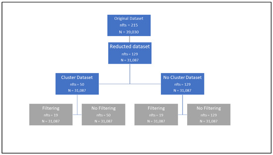Figure 1 shows the different datasets that were generated. In the root, we have the original dataset (number of features (nfts) = 215; population (N) = 39,030). The second-level dataset corresponds to the first filtering (number of features (nfts) = 129; population (N) = 31,087). That is, after removing irrelevant variables (those with a high number of null values/categories or without semantic predictive potential), we have our “Reducted dataset”. The third-level datasets are the cluster dataset (which is the one where the mental disorders were clustered (leading to 50 features)) and the no cluster dataset (where the original specific mental disorders were maintained (maintaining 129 features)). In the leaf nodes (in gray), we have the final 4 datasets that were used for the creation of the machine learning models. Filtering and no filtering are explained in the next section.