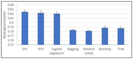 Regarding the model selection on the filtered and non-clustered dataset, the three best-performing models have an overlapping confidence interval (see Figure 2). Consequently, their difference in performances is not statistically significant. However, their precision scores are significantly better than all the other models. As a matter of fact, we can conclude that SVC, MLP, and logistic regression are the best choices out of the seven tested. They have a precision ranging from 0.824 ± 0.002 to 0.8204 ± 0.003, an F1 score between 0.671 ± 0.006 and 0.64 ± 0.02, and a recall score from 0.567 ± 0.007 to 0.533 ± 0.008.
