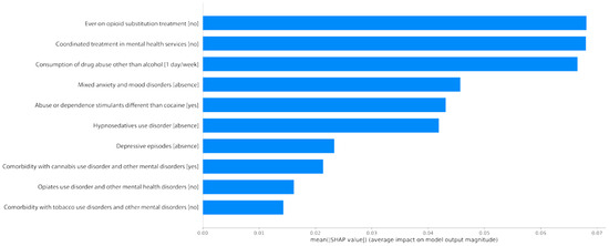 Moreover, explainability is an important factor in these models. Given that the models that have obtained the best efficiency are black-box models, this manuscript presents an analysis of their main characteristics through the SHAP approach, which allows a clearer understanding of the main variables that are influencing the model. This methodological approach is novel with respect to existing studies that apply artificial intelligence techniques to predict a therapeutic outcome in substance use disorder patients [30]. In addition, its extrapolation to other treatments for patients with mental health problems in general, where high rates of treatment abandonment and non-compliance with medical prescriptions are observed, should be assessed [31].