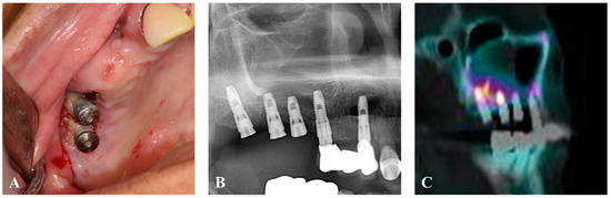 A 78-year-old female, in treatment for diabetes mellitus type 2, hypercholesterolemia, and hypertension, visited Jeonbuk National University Hospital (Jeonju-si, Republic of Korea) on 20 October 2022 and presented with persistent pain, swelling, and malodor after implant placement in the upper right maxilla. The patient had a history of osteoporosis treated with bisphosphonates (Fosamax 70 mg once weekly) since 2010, with bone exposure persisting for more than eight weeks. Surgery was planned for medication-related osteonecrosis of the jaw. Bone single-photon emission computed tomography/computed tomography (SPECT/CT) using technetium-99m hydroxymethylene diphosphonate revealed a high-risk hot spot from the right maxillary second molar to the right maxillary second premolar implants (Figure 1).
