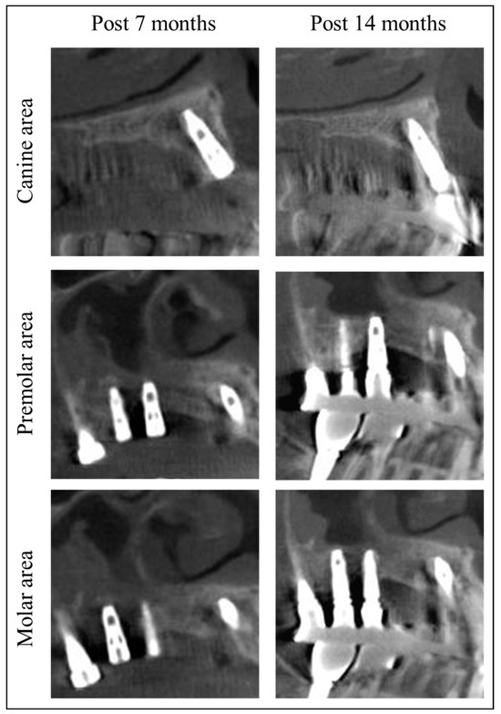 Since the patient’s residence was far from the hospital, she was instructed to have her stitches removed at a local dental clinic in 10 days. Post-surgery at 4 months, soft tissue and bone healing was successful without infection or MRONJ recurrence (Figure 2F and Figure 3). The patient stated that they underwent implant placement surgery again at a local dental clinic 5.5 months after the previous implant surgery, without any additional bone grafting surgery. At the 7-month follow-up, stable healing without bone resorption was observed, and the implant was placed at the local clinic (Figure 2G). Fourteen months post-surgery, there was no recurrence of MRONJ, and CBCT showed an improvement in sinusitis and the remodeling of the grafted bone into a cortico-cancellous complex, allowing for implant placement without additional bone grafting (Figure 4). The second maxillary molar implant site also showed no signs of MRONJ recurrence up to 14 months post-surgery.