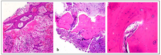 Histological analysis revealed that both the sequestrum and red fluorescent bone showed the destruction of the bone matrix with actinomycosis infection, necessitating removal (Figure 5a,b). Non-red fluorescent bone tissue, removed for alveoloplasty due to its sharp edges, showed no pathological elements and was deemed normal bone tissue (Figure 5c). This finding aligns with previous research indicating that non-red fluorescent bone tissue need not be removed.