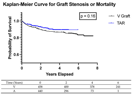 TAR has been associated with decreased cardiac events and increased graft survival in prior studies [37,38]. In our study, we found a trend towards decreased graft stenosis at six months, one year, and two years. We also had a trend towards a decrease in the composite endpoint of graft stenosis and mortality using Kaplan–Meier analysis. This is encouraging for the TAR group; however, it is important to remember that these data are limited by follow-up and a time delay. Many benefits of TAR may not be seen for 5–10 years and this is far beyond the follow-up of this study.