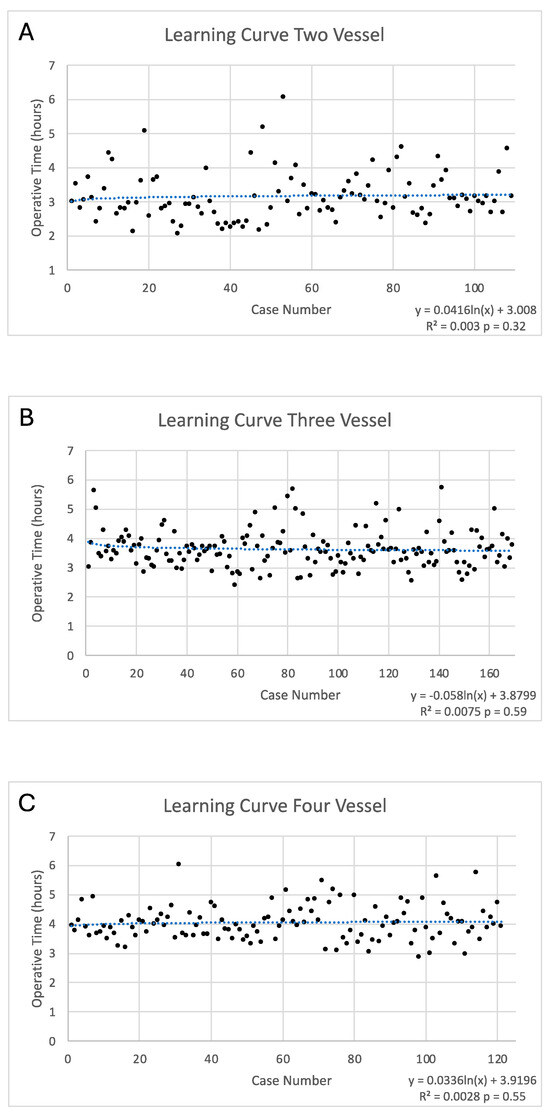 Learning Curve for Total Arterial Revascularization. (A) shows the learning curve for two vessel total arterial revascularization (TAR). There was no significant learning curve with two vessel TAR using linear regression. (B) shows the learning curve for three vessel TAR. There was no significant learning curve with three vessel TAR using linear regression. (C) shows the learning curve for four vessel TAR. There was no significant learning curve with four vessel TAR using linear regression.