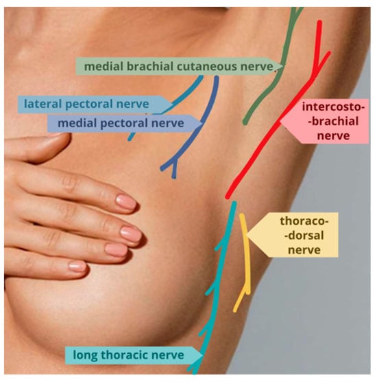 Breast cancer is one of the most frequently diagnosed cancers in the adult population worldwide (over 2.2 million new cases in 2022) [1], as well as in Poland (over 21,000 new cases in 2021) [2]. The standard procedure is surgery, the extent of which is defined by the stage of the disease. Surgical procedures include breast-conserving treatment (BCT), mastectomy, and axillary lymphadenectomy—removal of the sentinel node or all nodes in the axillary region. The specific and complex innervation of the surgical area originating from both the brachial plexus and intercostal nerves causes these procedures to be associated with significant nociceptive stimulation, resulting in severe postoperative pain and a high risk of persistent postoperative pain in 25 to 60% of cases [3] (Figure 1).