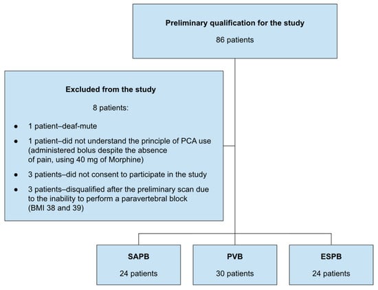 A well-documented and effective technique for disrupting intercostal nociception is the paravertebral block (PVB) [4]. Unfortunately, due to the anatomy of the paravertebral space, it carries a risk of pleural puncture and pneumothorax [5], as well as other potentially serious complications [6]. With the dynamic development of regional anesthesia, many new promising fascial blocks have emerged recently which can positively affect postoperative pain intensity and opioid consumption during and after surgery. Alternative blocks involving the anesthesia of intercostal nerve branches include the serratus anterior plane block (SAPB) and the erector spinae plane block (ESPB) [7,8,9,10]. There are many studies in the literature comparing the effectiveness of PVB to that of ESPB or SAPB. So far, there are no studies comparing the effectiveness of both fascial blocks to the paravertebral block. In accordance with PROSPECT recommendations, the researchers of this study decided not to create a control group in which no method of regional anesthesia was used. The control group included patients who underwent a PVB.