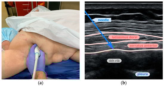 Serratus anterior plane block: (a) placement of the probe at the fourth-rib level for SAPB; (b) an ultrasound image of the serratus anterior and latissimus dorsi muscles.