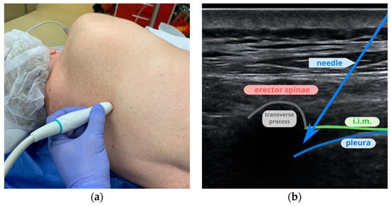 Paravertebral block: (a) placement of the probe between the fourth and fifth ribs for PVB; (b) an ultrasound image of the costotransverse joint and internal intercostal membrane (i.i.m.).