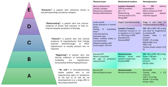 To overcome these limitations and improve diagnostic and prognostic accuracy, in 2019, the Society of Cardiovascular Angiography and Intervention published a new model for the diagnosis and classification of CS, dividing this clinical situation into five stages with increasing severity []. At each stage, cardiac arrest is proposed as a disease modifier, considering its impact on both pathophysiology and clinical evolution.