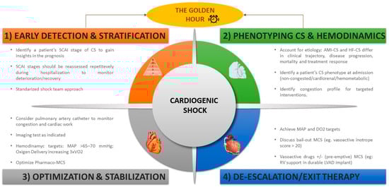 In summary, early detection of patients at risk of CS is crucial. This can be achieved by using a combination of clinical, hemodynamic, and echocardiographic data based on a standardized shock team approach. Hemodynamic monitoring is recommended to complete phenotyping, ascertain filling pressures, improve prognostic prediction, and guide therapeutic maneuvers. Hemodynamic support should be individualized depending on the patient’s characteristics, SCAI shock stage, and phenotype. Recovery of organ function and an “Exit Therapy” are essential for survival from CS. Therefore, the therapeutic goals in CS should be restoring tissue perfusion and organ function, facilitating recovery of cardiac function, or, in the absence of adequate recovery, bridging to an “Exit Therapy” (Figure 3). The “CS journey” can therefore be conceptualized into four phases: Recognize/Rescue–Optimization–Stabilization–de-Escalation/Exit Therapy (R-O-S-E) [].