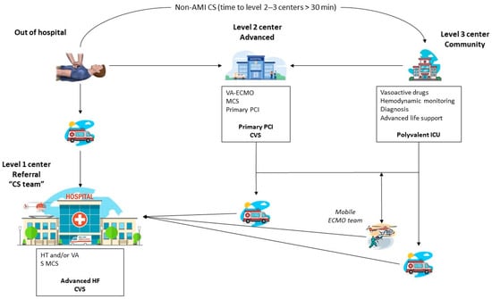 - Tehrani, B.N.; Sherwood, M.W.; Rosner, C.; Truesdell, A.G.; Ben Lee, S.; Damluji, A.A.; Desai, M.; Desai, S.; Epps, K.C.; Flanagan, M.C.; et al. A Standardized and Regionalized Network of Care for Cardiogenic Shock. JACC Heart Fail. 2022, 10, 768–781. [Google Scholar] [CrossRef] [PubMed]