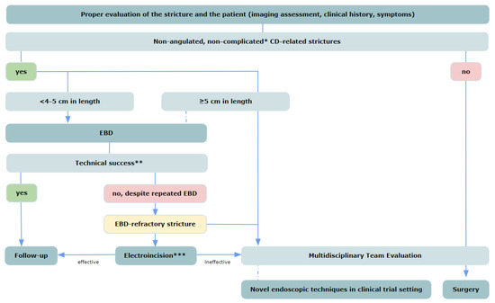 Endoscopic management of strictures in Crohn’s Disease based on the practice guidelines on endoscopic treatment for Crohn’s disease strictures [9]. CD, Crohn’s Disease; EBD, endoscopic balloon dilation. * No adjacent fistulae or abscesses; ** technical success in defined as post-procedural resistance-free passage of the endoscope through the stricture; *** only in centers with specific expertise.