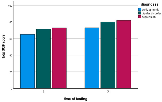 Table 3 (time point 1) shows the SCIP total scores in the three diagnostic groups. As described above, a one-way ANOVA was performed to assess group differences between psychotic, bipolar, and depressed patients. SCIP total scores differed significantly between the three diagnostic groups (F (2,140) = 7.119, p < 0.001, η2 = 0.092). Tukey post hoc analysis revealed a significant difference between the SCIP total scores of psychotic and depressed patients (p < 0.001) and between the psychotic and bipolar groups (p = 0.022). No significant group difference was found between bipolar and depressive diagnoses (p = 0.801).