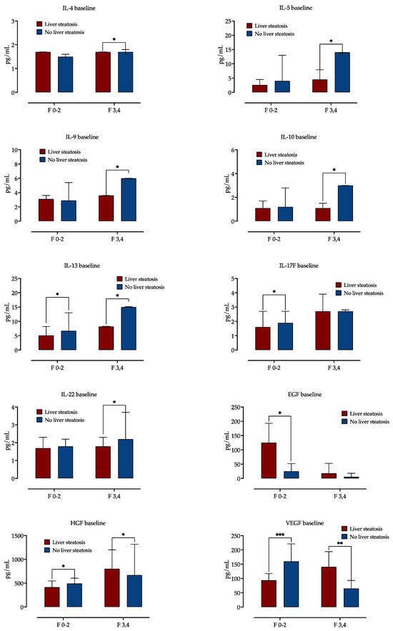 Baseline cytokine and growth factor serum concentrations according to presence of steatosis, stratified by fibrosis stage. Shown are medians with IQR, and difference significance is calculated by the Mann–Whitney test. *: p < 0.05; **: p < 0.01; ***: p < 0.001. Abbreviations: interleukine, IL; Epidermal growth factor, EGF; Hepatocyte growth factor, HGF; Vascular endothelial growth factor, VEGF.