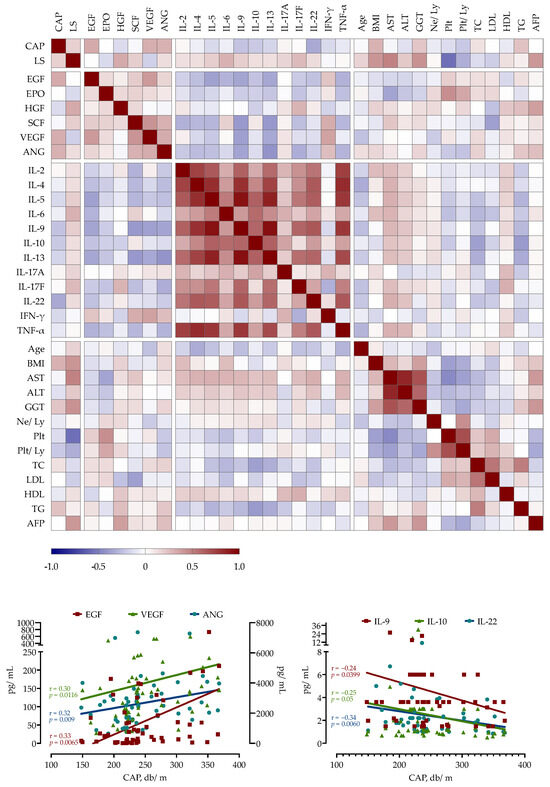 A correlation analysis was performed to identify potential correlations among paired laboratory parameters, including growth factor and cytokine concentrations and selected clinical variables. CAP, as a measure of liver steatosis, showed positive correlations with EGF (r = 0.33, p = 0.0065), VEGF (r = 0.31, p = 0.0091) and ANG (r = 0.30, p = 0.0116) but a negative correlation with a majority of measured cytokines (e.g., IL-9 r = −0.24, p = 0.0399; IL-10 r = −0.21, p = 0.05, IL-22 r = 0.34, p = 0.006). Liver stiffness had positive correlations with HGF (r = 0.33, p = 0.006), IL = 6 (r = 0.3, p = 0.012) and IL-17F (r = 0.27, p = 0.024). As shown in Figure 2, growth factors showed a negative correlation with measured cytokines, while the correlations between cytokines were mainly positive.