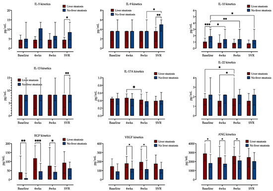 Comparison of cytokine and growth factor serum concentrations at four selected time points (before treatment, at weeks (wks) 4 and 8 of treatment and at time of sustained virological response, SVR), stratified by the presence of liver steatosis. Medians with IQRs are shown. Repeated measures two-way ANOVA with Tukey’s multiple comparisons test was used to calculate the source of the variations. *: p < 0.05; **: p < 0.01; ***: p < 0.001.
