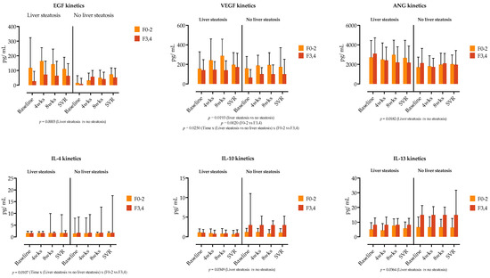 We further examined if the cytokine and growth factor serum kinetics in patients with liver steatosis were influenced by the presence of liver fibrosis. In a three-way ANOVA analysis, liver steatosis was linked with the kinetics of EGF, VEGF and ANG, while liver fibrosis was not a source of variation in our analysis (Figure 4). Similarly, as shown in Figure 4, IL-4, IL-10 and IL-13 levels were influenced by the presence of steatosis, while the main source of variation in IL-22 was time.