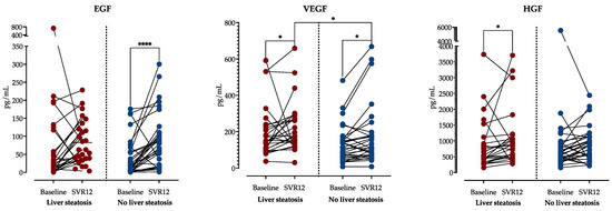 Although there was a significant decrease in VEGF levels in patients with and without liver steatosis at SVR12, steatotic patients still had significantly higher VEGF levels. EGF was significantly increased in patients without steatosis but remained unchanged in patients with steatosis at SVR12. On the contrary, HGF levels significantly increased in patients with steatosis but not in non-steatotic patients, as shown in Figure 5.