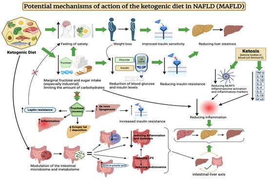 Potential mechanisms of action of the ketogenic diet in NAFLD (MAFLD). The above figure was created with BioRender.com, accessed on 8 August 2024. Agreement number: CR275R2WWY.