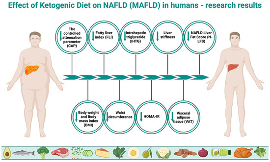 Effect of ketogenic diet on NAFLD (MAFLD) in humans. The above figure was created with BioRender.com, accessed on 8 August 2024. Agreement number: KZ275R2EJK.