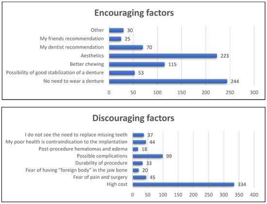 According to our study, the most encouraging factors for implantation are no need to wear dentures, aesthetic appearance and the possibility of better chewing. Among discouraging factors, the high cost of the procedure was the most frequently mentioned. The answers of the whole population are depicted in Figure 1.