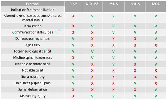 Comparison of cervical spine management protocols. CCS = Canadian cervical spine rule; NEXUS = national emergency X-radiography utilization study; MTLS = military trauma life-support protocols of the Israeli Defense Forces; PHTLS = prehospital life-support protocols; MDA = Magen David Adom (the Israeli civilian organization for prehospital care) protocols. (*) The CCS and the NEXUS criteria are meant to indicate spinal imaging in-hospital; the MTLS, PHTLS, and MDA protocols are meant to indicate spinal immobilization in the prehospital setting.