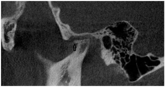 When degenerative changes are suspected, cone-beam computed tomography is the preferred imaging modality. CBCT is employed to assess the bony cortices of the condylar head and the glenoid fossa, the level of calcification in the condylar head, and the temporomandibular joint spaces. According to the Diagnostic Criteria for Temporomandibular Disorders (DC/TMD) guidelines, the diagnosis of degenerative joint disease can be confirmed if computed tomography (CT) imaging reveals at least one of the following features: subchondral cysts, erosions, generalized sclerosis, or osteophytes [,,]. This 3D imaging method inherently removes superimposition and distortion, providing high-spatial-resolution images. Other benefits of CBCT include shorter scan times and lower radiation doses compared to other methods, given that the appropriate imaging parameters are used. CBCT is a dependable method for analyzing the bony structures of the TMJ in coronal, axial, and sagittal views. In CBCT, images can be reconstructed within the image volume for easier visualization of the TMJ [,,,].