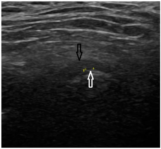 Ultrasound (articular disc—black arrow, osteophyte—white arrow).