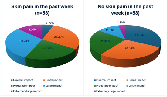 The impact of skin pain on mental health was investigated in other dermatoses. For instance, Vakharia et al. [48] conducted research on 144 patients with atopic dermatitis (AD), in which 42.7% of participants reported skin pain in the past week, involving 42 (13.8%) with severe or very severe pain. Skin pain severity was more strongly correlated with the DLQI (r = 0.45) and the Patient Health Questionnaire-9 (r = 0.36) (p < 0.0001 for both) than in our research. Additionally, strong correlations between skin pain and the Patient Oriented Eczema Measure (r = 0.54), the Itchy Quality of Life (r = 0.52), the 5-dimensions of itch scale (r = 0.47), the NRS for itch (r = 0.43) and sleep (r = 0.36), the patient-reported global AD severity (r = 0.34), the Eczema Area and Severity Index (r = 0.23), and the objective Scoring AD index (r = 0.20) (p < 0.0001 for all) were identified. In particular, skin pain exerted a negative influence on the capacity to shop and execute other activities of everyday life, make clothing choices, engage in social interactions or leisure activities, study or work, participate in sports, maintain relationships with others, experience normal sexual function, and manage treatment-related burdens (p ≤ 0.017 for all).