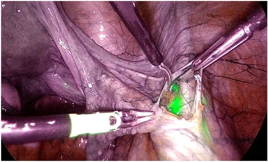 - Ianieri, M.M.; Della Corte, L.; Campolo, F.; Cosentino, F.; Catena, U.; Bifulco, G.; Scambia, G. Indocyanine green in the surgical management of endometriosis: A systematic review. Acta Obstet. Gynecol. Scand. 2021, 100, 189–199. [Google Scholar] [CrossRef] [PubMed]