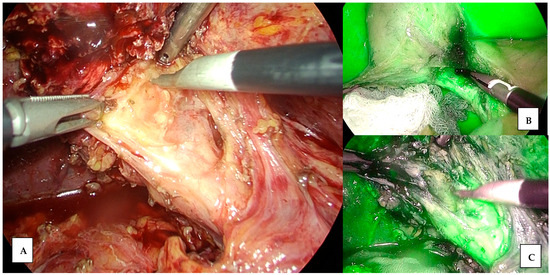 Another field of application of ICG fluorescence is elective minimally invasive cholecystectomy. Laparoscopic cholecystectomy (LC) remains one of the most commonly performed procedures in adult and pediatric populations. Despite the advances made in intraoperative biliary anatomy recognition, iatrogenic bile duct injuries during LC represent a dramatic complication, sometimes even life-threatening. Moreover, bile duct injuries constitute an economic burden for healthcare systems. Based on the literature, a series of methods have been proposed to prevent bile duct injury, with the use of ICG fluorescence among them (Figure 3). Despite widespread adoption and evaluation in recent years, variations persist in ICG’s clinical utility, including the dose, concentration, and timing of administration. The most commonly reported method of ICG injection is intravenous administration, while the literature lacks studies investigating the direct injection of ICG into the gallbladder [59,60,61]. In a mini review by Symeonidis S. et al. including four prospective cohort studies, three case–control studies, and one case report, intra gallbladder ICG injection is a promising method to achieve biliary mapping, overcoming the limitations of intraoperative cholangiography including intervention and radiation exposure, as well as the high hepatic parenchyma signal and time interval needed in intravenous ICG fluorescence [62]. The same findings were reported by the meta-analysis performed by LIM SH, which compared ICG cholangiography with intraoperative cholangiography in minimal-access cholecystectomy for visualization of the extrahepatic biliary tree. concluding that it is safe and improves visualization of the bile duct [63].
