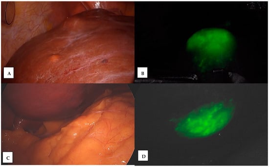 In the context of hepatobiliary surgery, ICG has also found applications in liver resection and transplant. According to a different study, ICG-navigated resection is useful for partial liver resection and anatomical liver resection for liver cancer and extended cholecystectomy for gallbladder cancer [64,65,66]. Recently, indocyanine green ICG imaging has been used to identify hepatic tumors and segmental boundaries during hepatectomy (Figure 4). Based on the review of Takemura N et al., the advantages of ICG fluorescent segmental staining are its high reproducibility and sensitivity [67]. It stays in the injected segment for a few hours because ICG is taken up by hepatocytes. Moreover, the segmental border inside the liver can also be visualized by this technique, thus providing intraoperative navigation. Regarding another unique application of ICG fluorescence imaging, Kawaguchi et al. applied ICG fluorescence imaging to investigate the decreased functional reserve of the venous congestion area after the resection or clumping of drainage veins [68]. They used the difference in fluorescence intensity, which was interrupted due to venous congestion and subsequent interrupted portal uptake function. The effect of the venous congestion area on liver function remains unclear. Sano et al. evaluated the venous congestion area in liver grafts for liver transplantation [69]. They reported portal flow regurgitation in the venous congested area and the necessity of venous reconstruction in liver grafts. However, the opening of peripheral venous communication released venous congestion in some patients. Mise et al. recommended subtracting the volume of the venous congestion area from the future functional remnant liver volume that is calculated before major hepatectomy [70]. Another use of ICG in liver transplant surgery is to assess if the donor’s liver is suitable before transplantation. By injecting ICG into the donor’s bloodstream, surgeons can evaluate the liver’s function and blood flow using ICG clearance parameters, helping them to determine whether the organ is suitable for transplantation. This preoperative assessment can help reduce the risk of complications and improve the overall success of the procedure. After the transplantation, ICG can be used to continue monitoring the graft’s function and blood flow during the postoperative period using ICG kinetics during the following days after transplantation; this includes the evaluation of ICG clearance just like in the preoperative phase. This can help detect any issues early on and guide the management of the patient’s care [71].